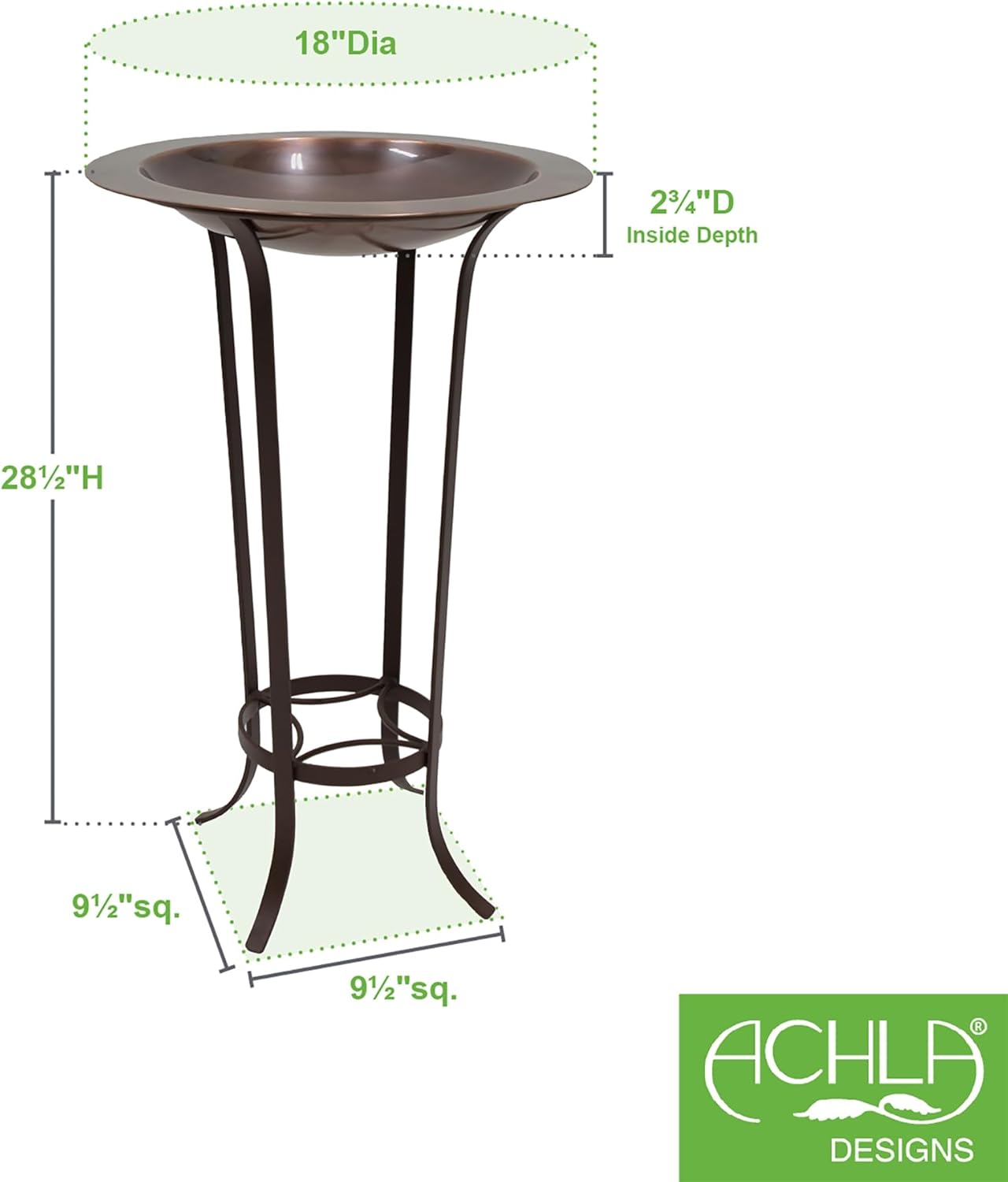 - Ideal Dimensions: The bowl measures 18 inches in diameter and 3 inches deep with a 2-inch wide rim. The total height of the birdbath with the stand is 28 1/2 inches, complemented by a 9 1/2-inch square footprint, making it a perfect focal point without overwhelming your space.