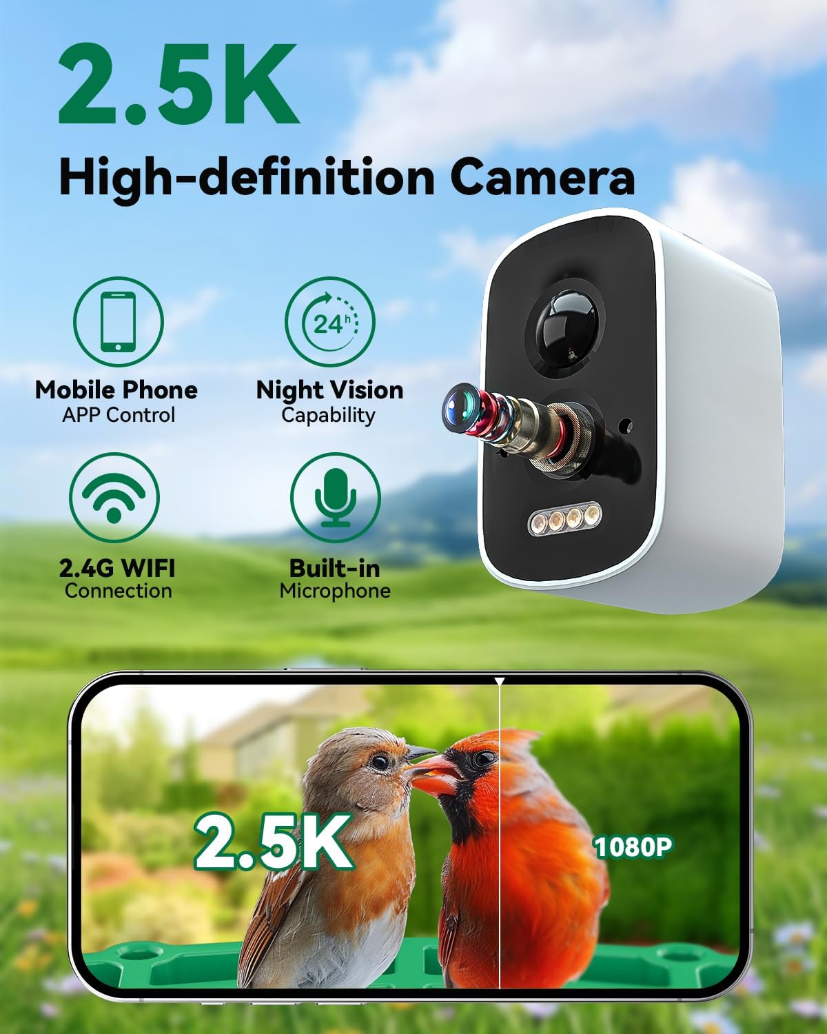 - [2.5K HD Camera with Night Vision]-The smart bird feeder is equipped with a 2.5K HD camera, up to 4 million pixels, With 130° wide angle, this bird feeder camera gives you the best color images and video even at night, giving you the best visual experience