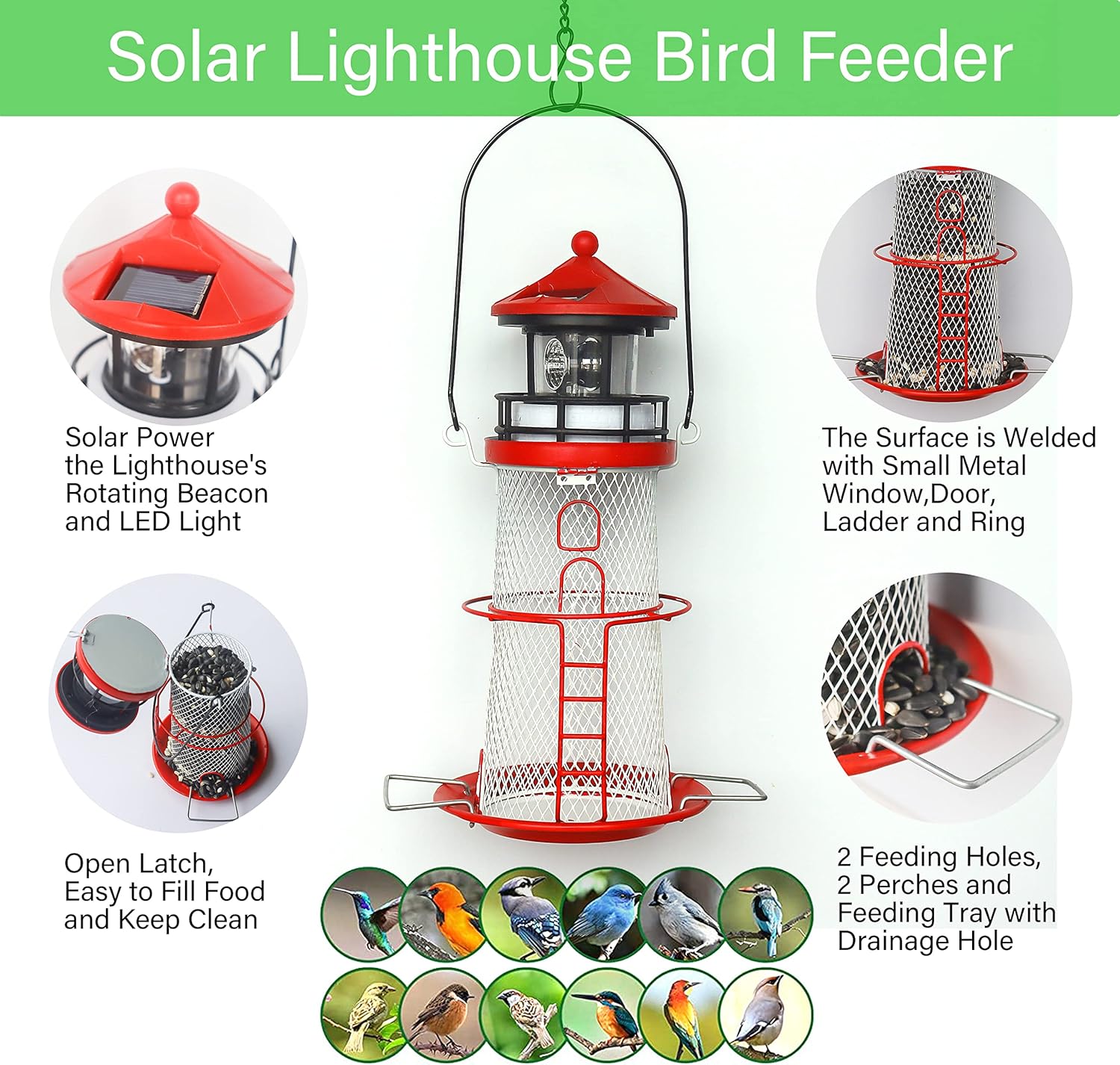 - 【Stylish design】Made of durable, high quality metal. Metal mesh makes it easy to attract wild birds and monitor your seed level at all times. Solar powered auto on/off light that charges in the sun during the day and automatically lights up at dusk while the beacon rotates. The bird feeder will add an attractive addition to your garden.