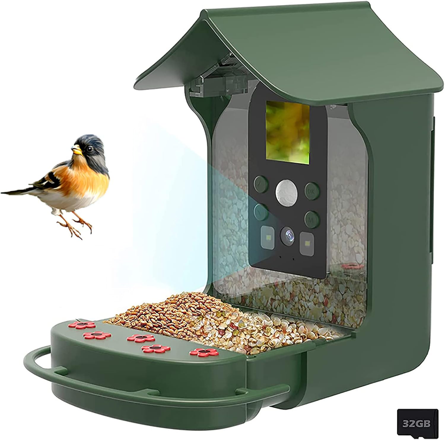 - Comprehensive Package: The birdhouse camera comes with a 400g food storage space, water sink, hummingbird feeder, stand, and essential mounting accessories including a mounting belt, handlebar mount, mount adaptor, USB cable, 32GB memory card, and card reader. Easy installation ensures you can position the birdhouse camera perfectly in your garden.