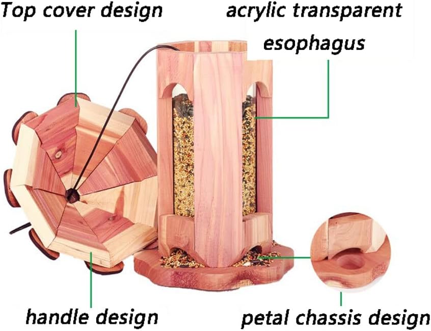 - Octagonal top cover with a matching feather piece and car wood top ensures double protection for your bird feed.